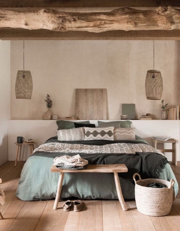 Mẫu phòng ngủ phong cách Scandinavian với các chất liệu đặc trưng như gỗ, sợi vải tự nhiên, mây tre,...