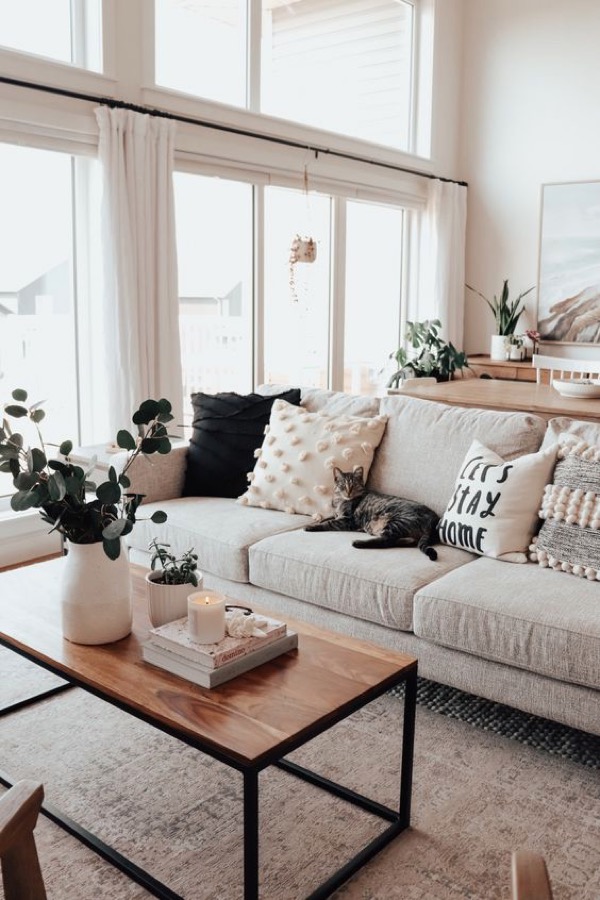 Căn phòng với nhiều cửa kính để tận dụng tối đa nguồn sáng tự nhiên và mở rộng diện tích căn phòng. Bên cạnh đó trang trí thêm cây xanh và sử dụng thêm các chất liệu tự nhiên như lông thú sẽ khiến phòng khách của bạn đậm chất Scandinavian hơn đấy.