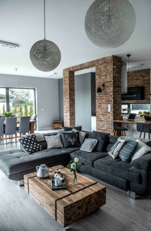 Giữ một bức tường gạch thô để là điểm nhấn nổi bật cho căn phòng. Phối tông màu nhạt và màu xám đậm khiến ngôi nhà trở nên hiện đại hơn. Cuối cùng là nhấn nhấn nhá bằng một chiếc bàn gỗ uống nước độc đáo.